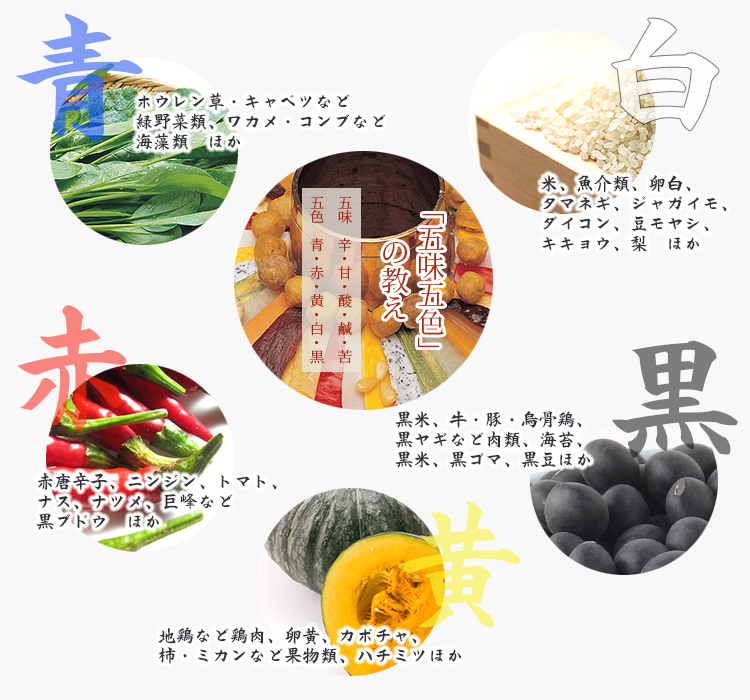 「五味五色」の場合、五行の「木・火・土・金・水」の順に、「辛・甘・酸・鹹(しょっぱい)・苦」(五味)、「青・赤・黄・白・黒」(五色)にあてはまります。韓国では、5つの色の食材を、5種類の味に味つけした料理を食卓に並べることで、栄養バランスのとれた健康的な食生活が送れると考えられ、実践されてきました。