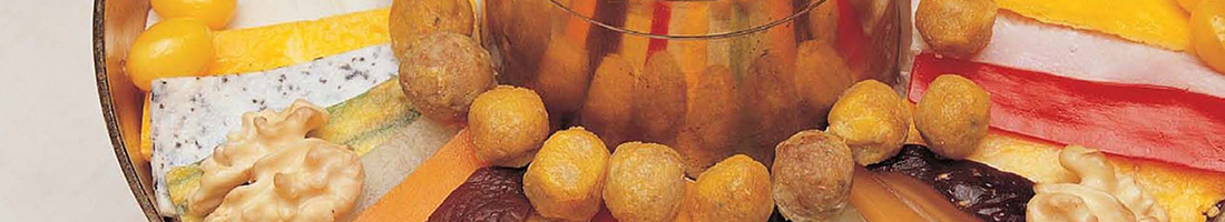宮廷料理の中で、現在もよく食べられているもののひとつに「九節板」(クジョルパン)があります。9つに仕切られた器に、せん切りにした8つの具材とそれを包んで食べるための皮(小麦粉を水で溶き、焼いたもの)を盛り合わせたものです。具材は、青(緑):キュウリや春菊、赤:ニンジン、黄:卵黄を焼いたものやタケノコ、白:卵白を焼いたものやダイコン、黒:牛肉や海苔、など五色の食材をそろえ、それを皮で巻いて、甘酸っぱい、または甘辛いタレなどにつけていただきます。各具材そのものに、それぞれ異なった味付けをしてあることも多いとか。こちらも、1品で「五味五色」が表された料理です。