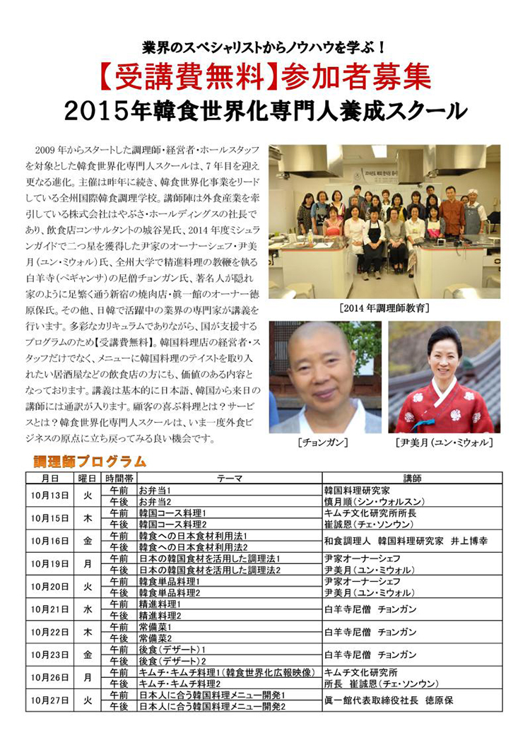 【受講費無料】参加者募集!2015年韓食世界化専門人養成スクール