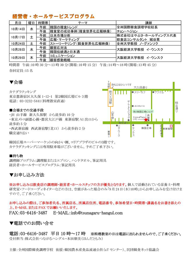 2009年からスタートしたレストランオーナー、調理師、ホールスタッフを対象とした韓食世界化専門人養成スクール、今年も10月13日(火)~29日(木)まで実施いたします。